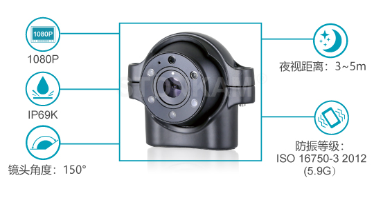 敏視1080p全高清大車攝像頭:防水防塵等級IP69K,夜視距離為5m,鏡頭角度:150°,防震等級:ISO 16750-3 ( 最大17.3G)。