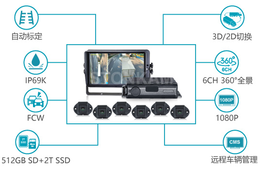 6路1080P高清防水360環(huán)視全景影像系統(tǒng)6路195°超廣角高清攝像頭輸入,視角多元化,3D、2D視角隨意切換,專為鉸接公交車、起重機(jī)、長拖車、貨柜車、消防車等各種超長車輛設(shè)計。IP69K防水,即使在惡劣的環(huán)境中也可為各種車輛提供360°全景鳥瞰,做到360°無死角監(jiān)控。具有強(qiáng)大的錄像功能,可提供512GB+2T SSD的大容量錄像儲存。