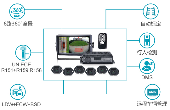 智能車載360全景影像系統(tǒng)支持6路大角度高清攝像頭輸入,同時(shí)符合BSIS/MOIS/RVCS法規(guī)要求。算法全新升級(jí),內(nèi)置行人檢測(cè)、LDW+FCW+BSD和DMS算法,實(shí)現(xiàn)車內(nèi)外智能車載監(jiān)控,適用于鉸接公交車、起重機(jī)、長(zhǎng)拖車、貨柜車、消防車等各種超長(zhǎng)車輛。