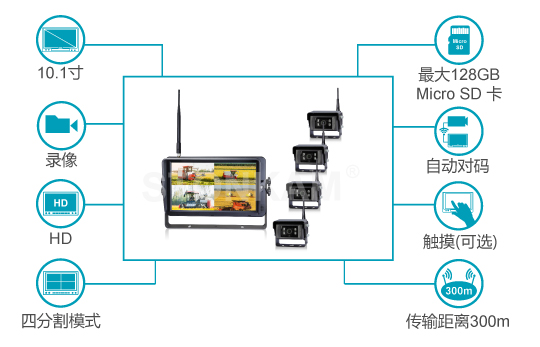 憑借一流的技術(shù)和品質(zhì),敏視10.1寸高清數(shù)字無線四分割監(jiān)控系統(tǒng)可應(yīng)用于各種車輛,如叉車,起重機(jī),收割機(jī)等。