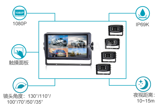 STONKAM 10.1寸高清車載顯示器監(jiān)控系統(tǒng),配有1080P/720P 4路高清顯示器和1080P/720P高清攝像頭,提供多種攝像頭圖像顯示模式;攝像頭防水防塵,帶IR燈,可選擇帶音和25幀/30幀,可選擇帶IR-CUT,徹底解決太陽光下照綠色植物等色彩偏差問題;車載顯示器系統(tǒng)可應(yīng)用于車載、船載監(jiān)控,又可應(yīng)用于室內(nèi)外的安防監(jiān)控。