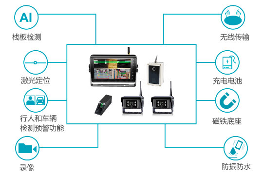 敏視叉車AI無線監(jiān)控系統(tǒng)安裝方便,功能豐富。顯示器集AI算法和錄像功能于一體,搭配叉車攝像頭和其他無線監(jiān)控攝像頭使用,可實現(xiàn)棧板檢測、激光定位&AI控燈、行人與車輛檢測等多種AI功能,在視線受遮擋的情況下,確保叉車作業(yè)安全高效進行。