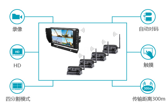 敏視10.1寸高清數(shù)字無線四分割監(jiān)控顯示器具備無線連接,安裝方便的特點(diǎn),同時(shí)支持錄像和觸屏功能;空曠傳輸距離遠(yuǎn)達(dá)300米(984ft),信號(hào)穩(wěn)定抗干擾。并可與高清無線攝像頭搭配組合成完美的高清數(shù)字無線監(jiān)控系統(tǒng),特別適用于卡車,叉車,挖土機(jī)等。