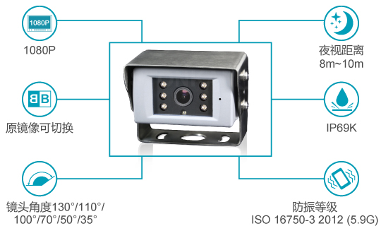 1080P;防水等級IP69K;鏡頭角度:130°;供電電壓:12V;夜視距離為8m~10m;防震等級:ISO 16750-3 (5.9G);工作溫度-20°~70° ;原鏡像可切換?等等。
