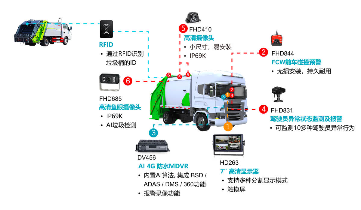 通過RFID自動(dòng)識(shí)別垃圾桶的ID,并將垃圾桶ID、GPS位置信息與圖片/視頻實(shí)時(shí)上傳至云端管理平臺(tái)實(shí)現(xiàn)垃圾清運(yùn)精細(xì)化運(yùn)營(yíng)。此外,該解決方案集成BSD&FCW&DMS&360AVM功能,實(shí)現(xiàn)車內(nèi)外主動(dòng)安全預(yù)警。
