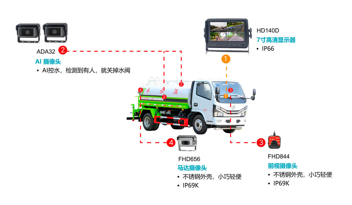敏視通過部署多路攝像頭(DMS、FCW、BSD攝像頭、360°全景環(huán)視)結(jié)合AI視覺識(shí)別技術(shù),實(shí)現(xiàn)駕駛員監(jiān)測(cè)、行人車輛識(shí)別以消除盲區(qū),并可結(jié)合雷達(dá)避障進(jìn)行主動(dòng)預(yù)警;依托AI 4G車聯(lián)網(wǎng)平臺(tái),支持車輛統(tǒng)一調(diào)度與精細(xì)化管理。針對(duì)特種車輛不同作業(yè)場(chǎng)景,垃圾車可用RFID識(shí)別垃圾桶ID,灑水車可智能識(shí)別行人車輛并調(diào)控噴水,全面提升作業(yè)安全、效率與管理水平。