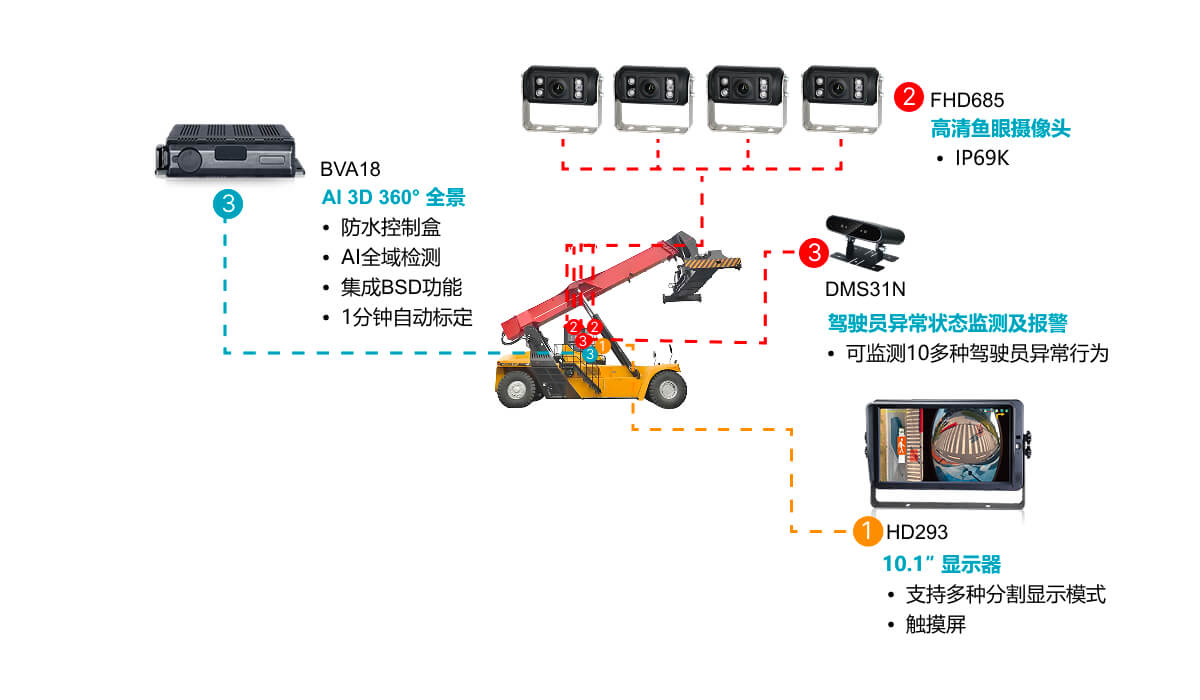 提供360°全景環(huán)視,實(shí)時(shí)感知周邊人員、車輛;同時(shí)監(jiān)測(cè)駕駛員疲勞與分心狀態(tài)并預(yù)警,防止誤操作。所有異常事件與視頻可同步上傳平臺(tái),實(shí)現(xiàn)智能平臺(tái)管理。